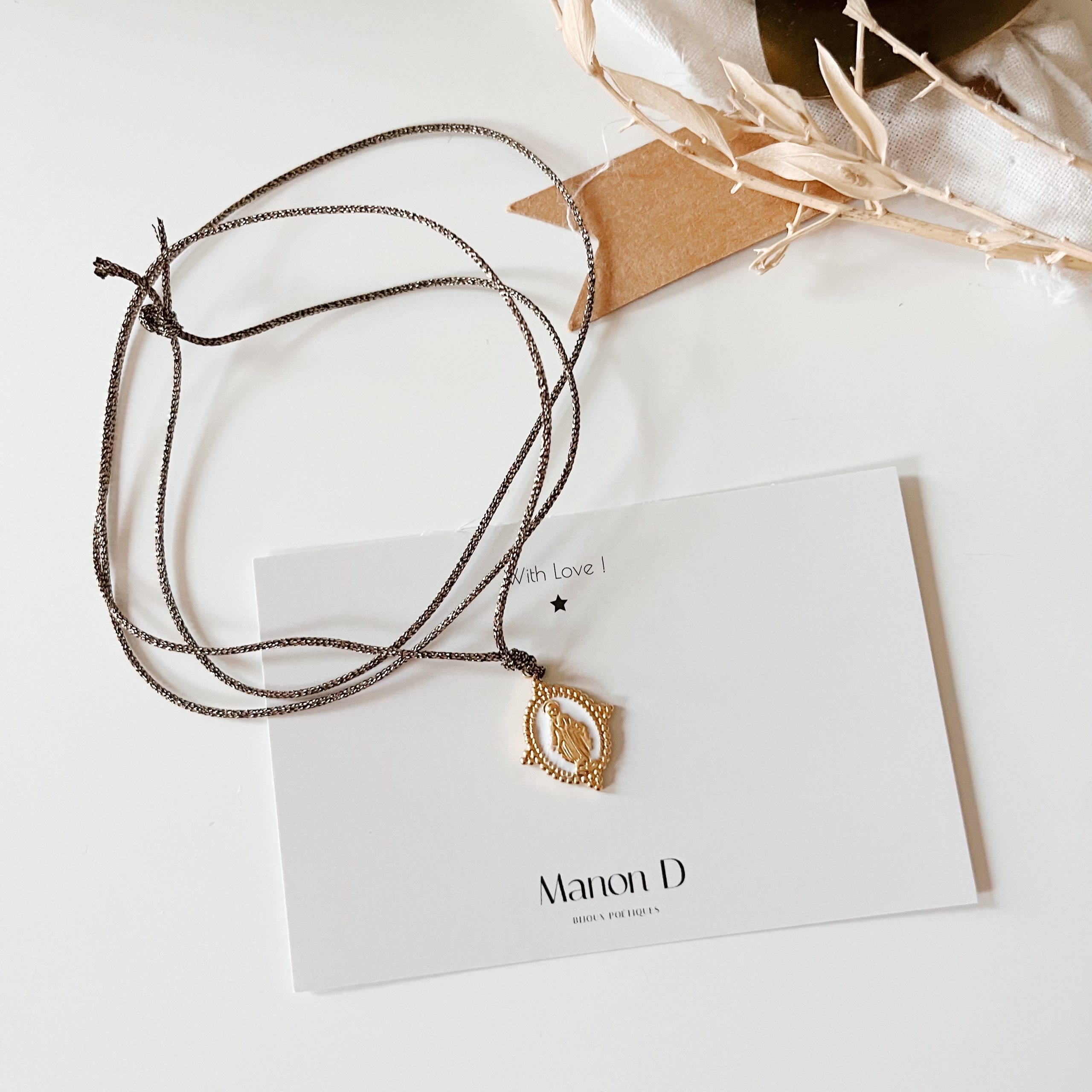 Collier « Grigri – Médaille Vierge » (Email Blanc – Cordon Lurex)