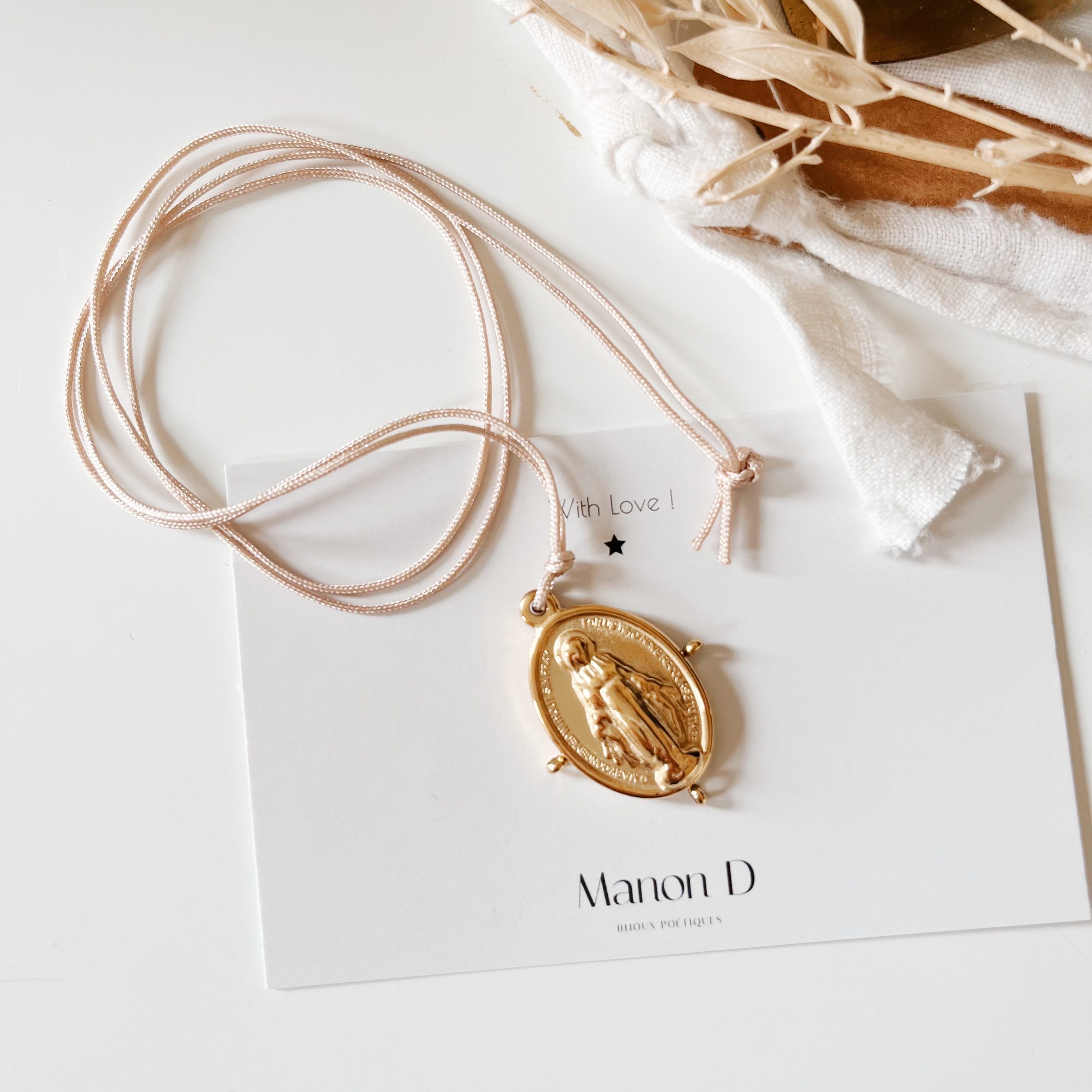 Il est composé d’un pendentif oval (22mm) avec un motif religieux,